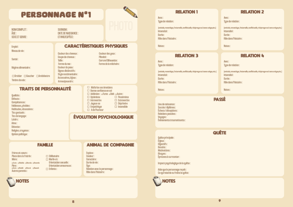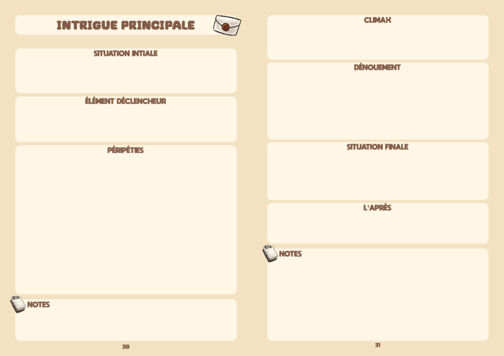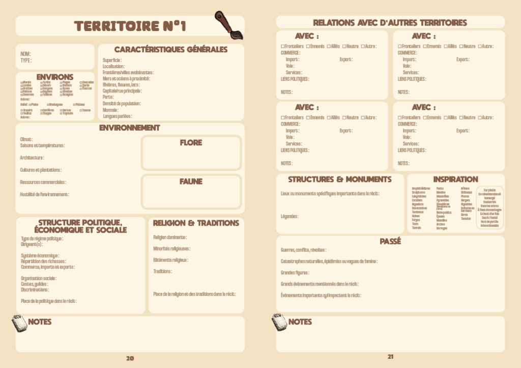 • La création de votre univers, avec 4 fiches détaillées pour créer les régions les plus importantes de votre récit (paysage, géo-politique, religion, population…).