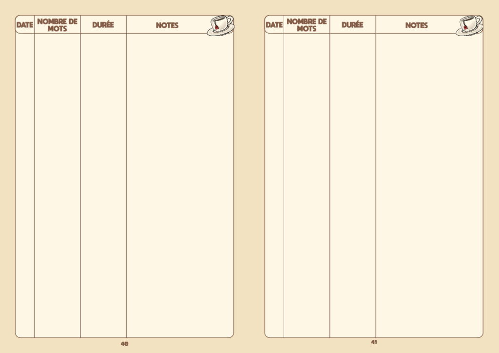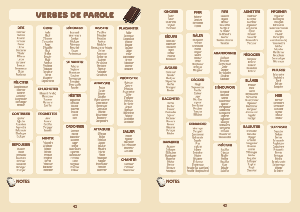 • Une partie écriture, où vous pouvez noter toutes vos séances d’écriture, leur date, le nombre de mots écrits, la durée. Vous trouverez également des centaines de mots pour des incises, la gestuelle des personnages, pour éviter les répétitions et les verbes ternes.