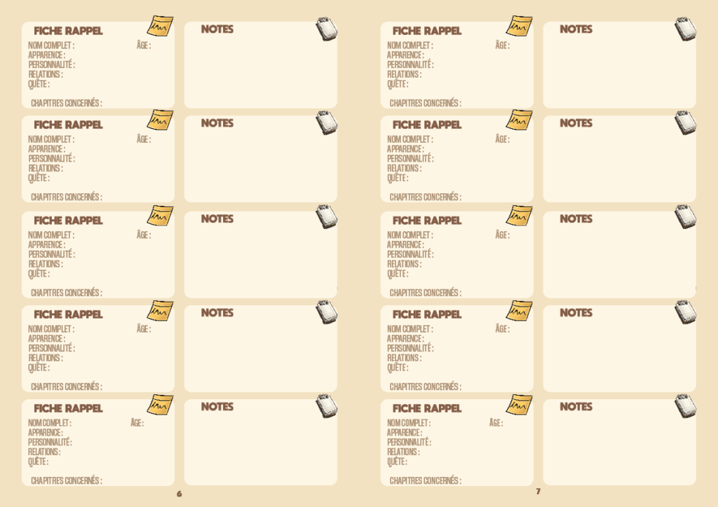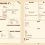 • La création des personnages, avec 4 fiches complètes pour les protagonistes et deux pages moins détaillées pour une dizaine de personnages secondaires.